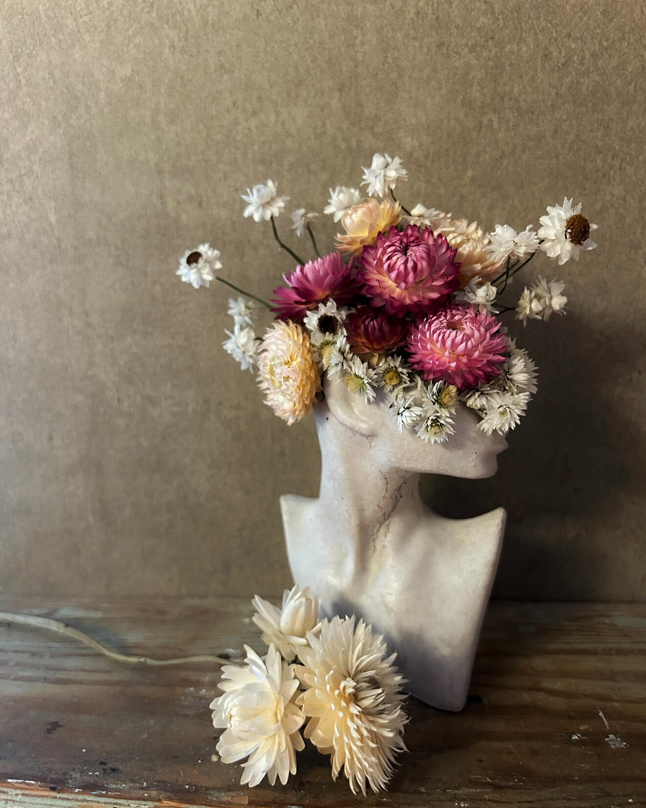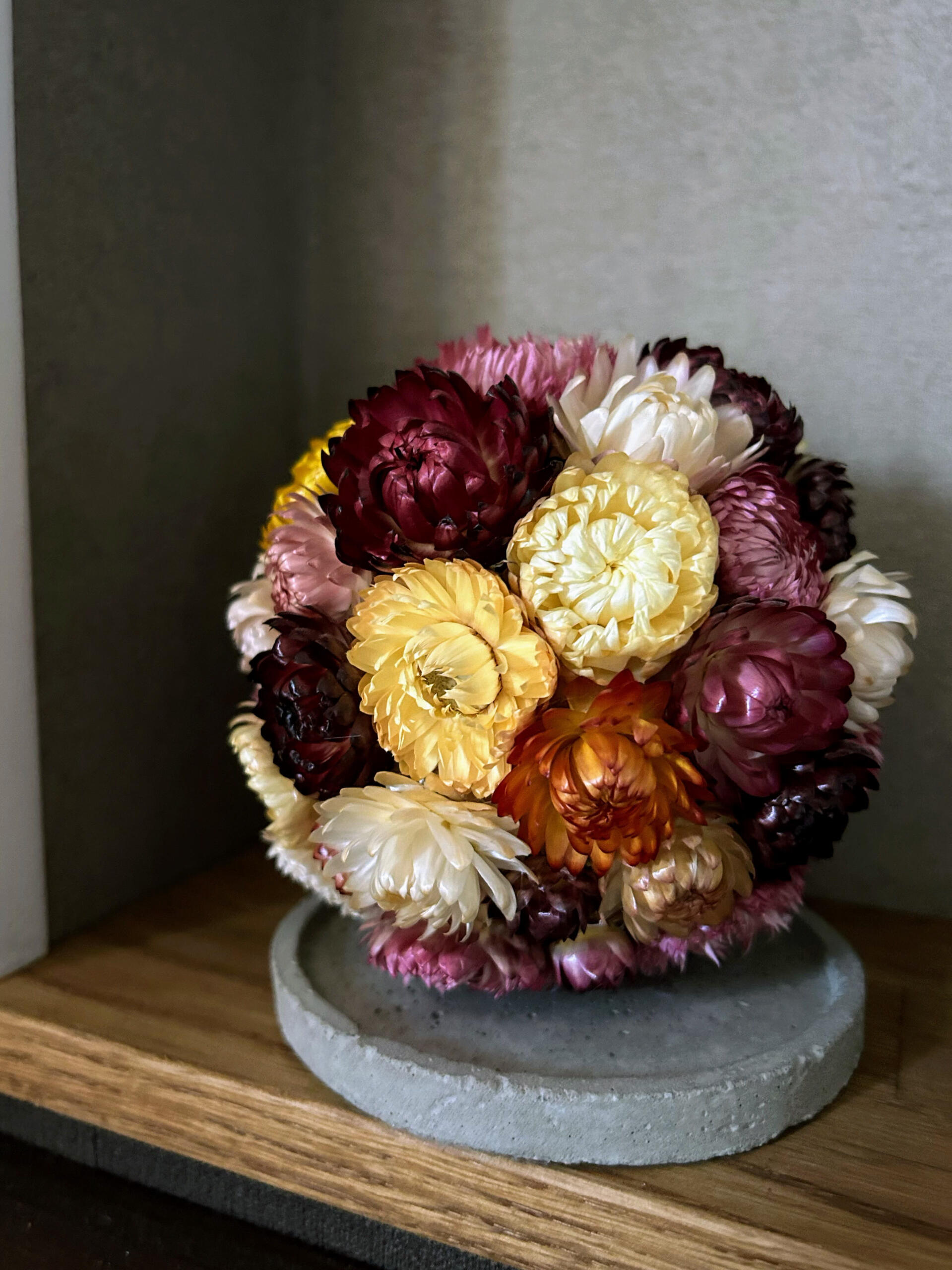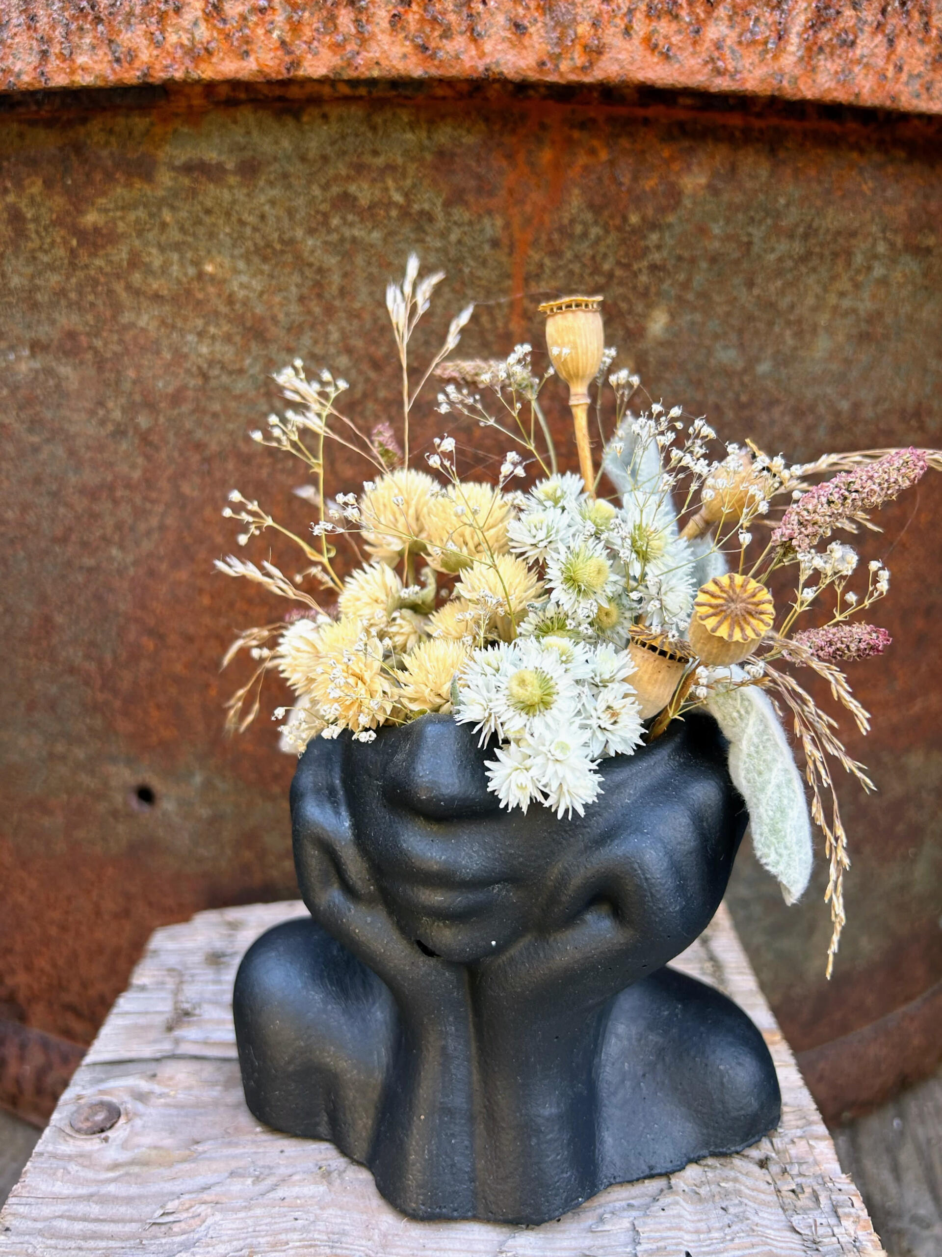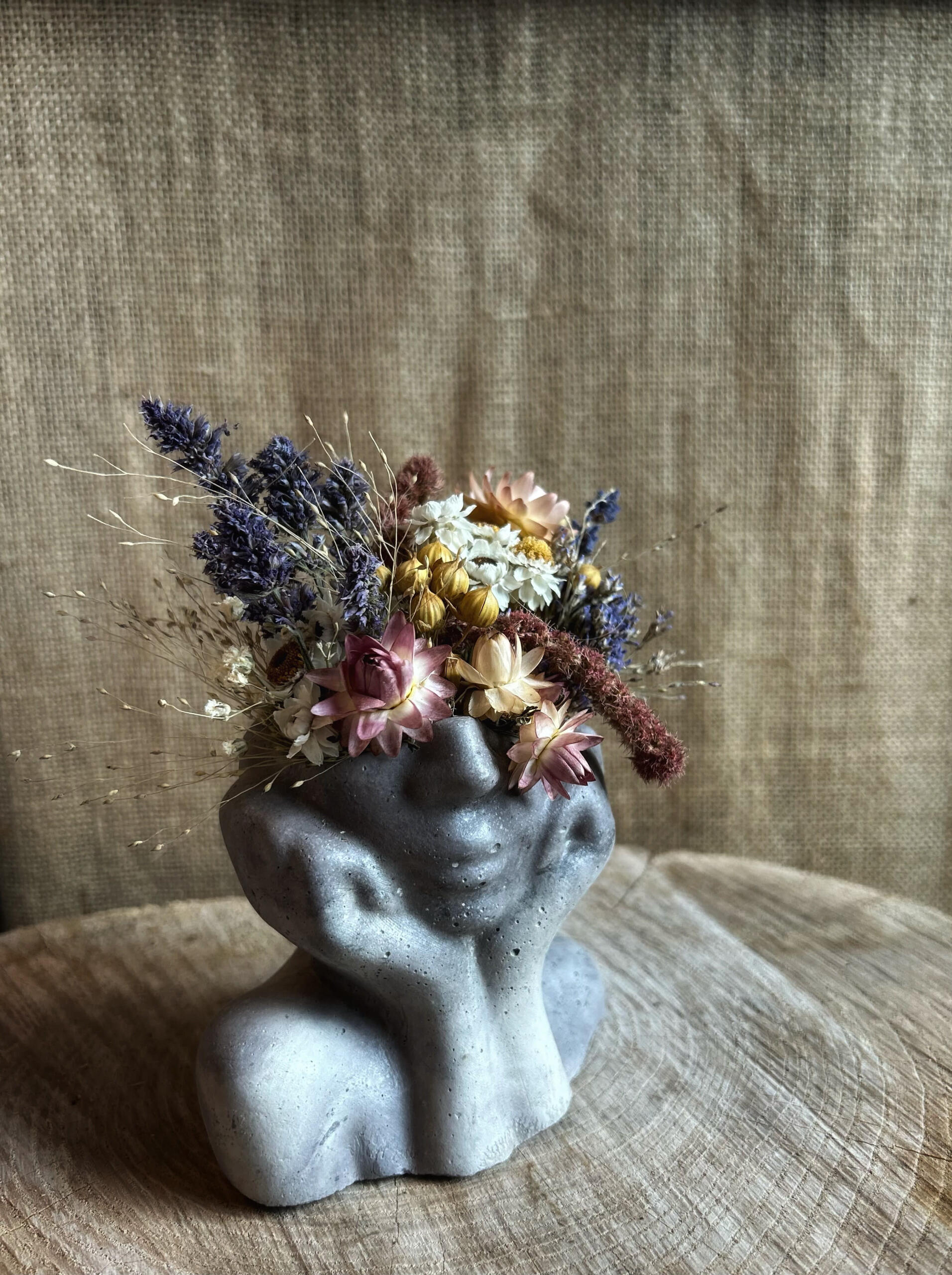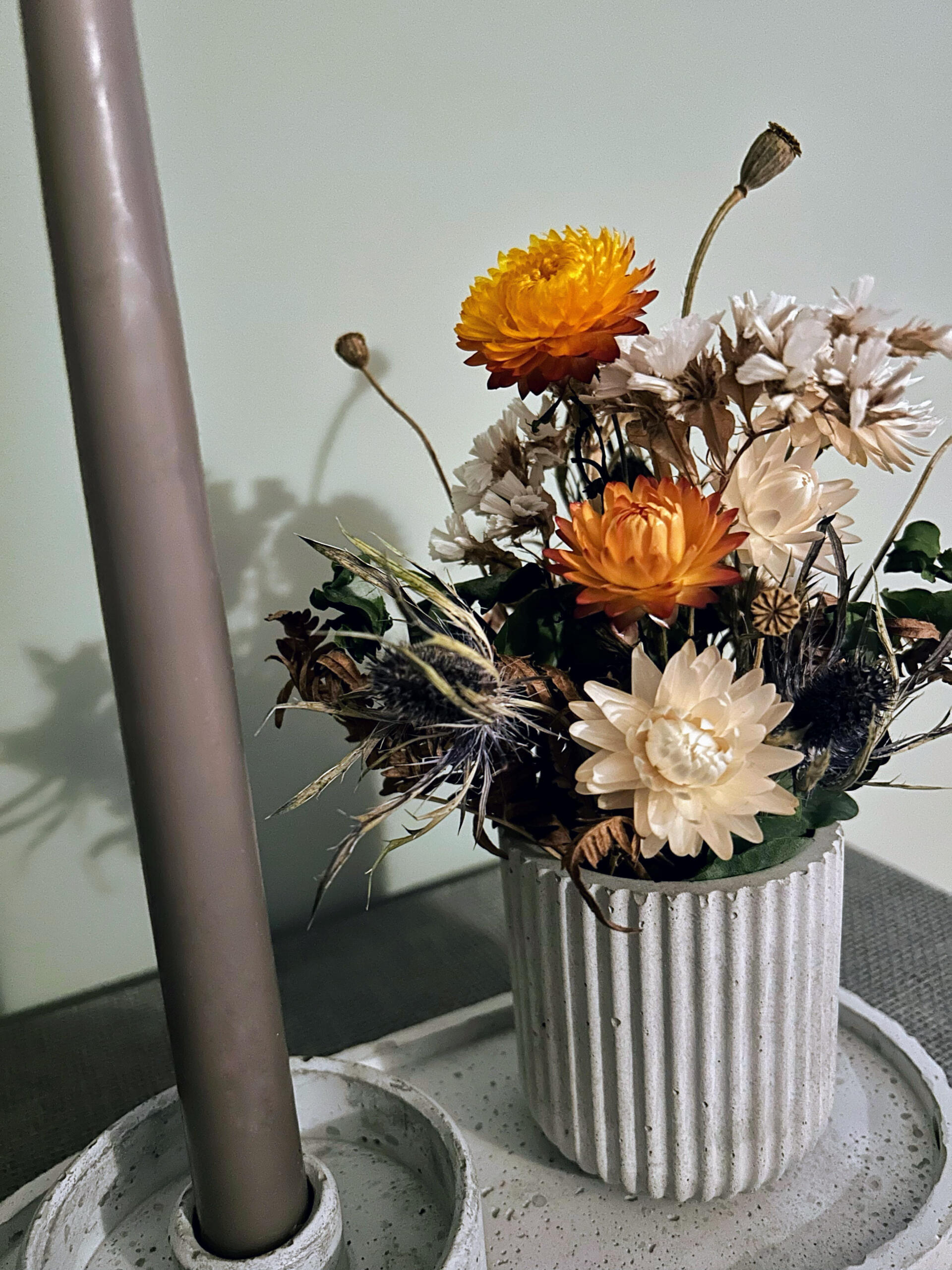 Torkade blommor har en skönhet som varar länge och är ett hållbart sätt att förlänga blomsterkänslan. Hos Blommor & Betong skapar jag unika arrangemang och dekorationer av torkade blommor, perfekta för att smycka ditt hem eller din arbetsplats. Varje skapelse formas med samma omsorg och kärlek som mina färska blommor, så att naturens former kan leva kvar över tid.Att använda torkade blommor, särskilt under vintern när färska blommor oftast importeras, är ett medvetet och hållbart val. De minskar utsläppen genom att minimera transporter. Precis som mina snittblommor är dom också helt giftfria, vilket gör dem till ett hälsosammare och mer miljövänligt alternativ.