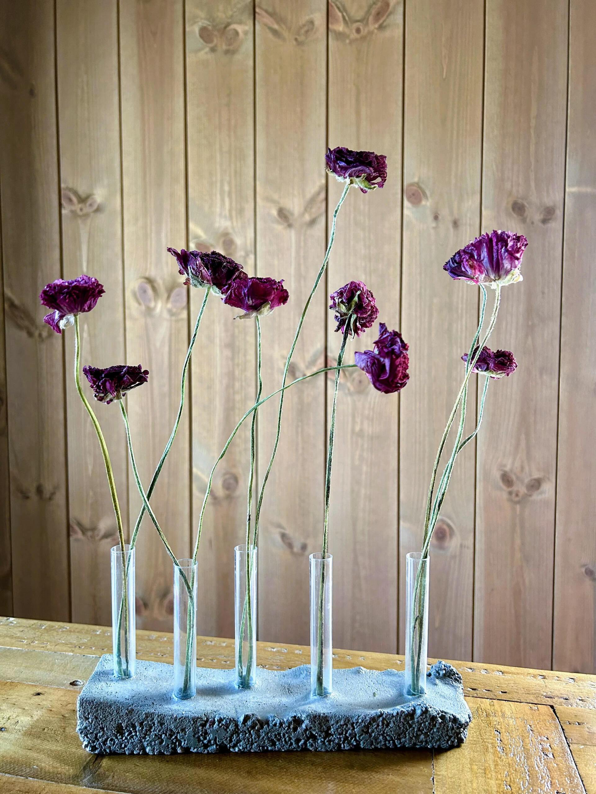 Som ett rustikt komplement till blommorna skapar jag även handgjorda betongdetaljer – fat, vaser och prydnader som ger en vacker kontrast till det levande.